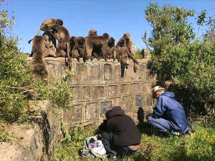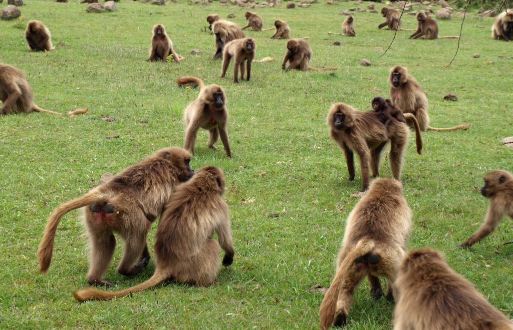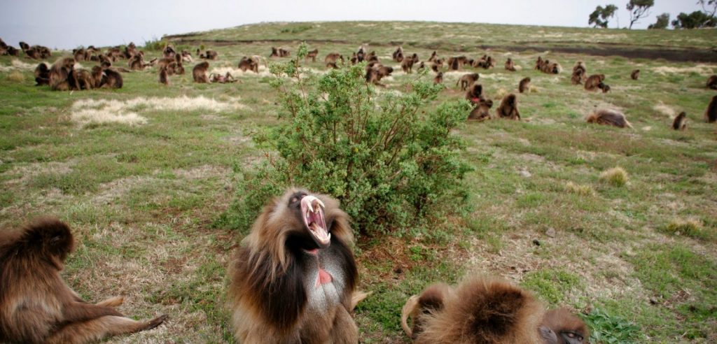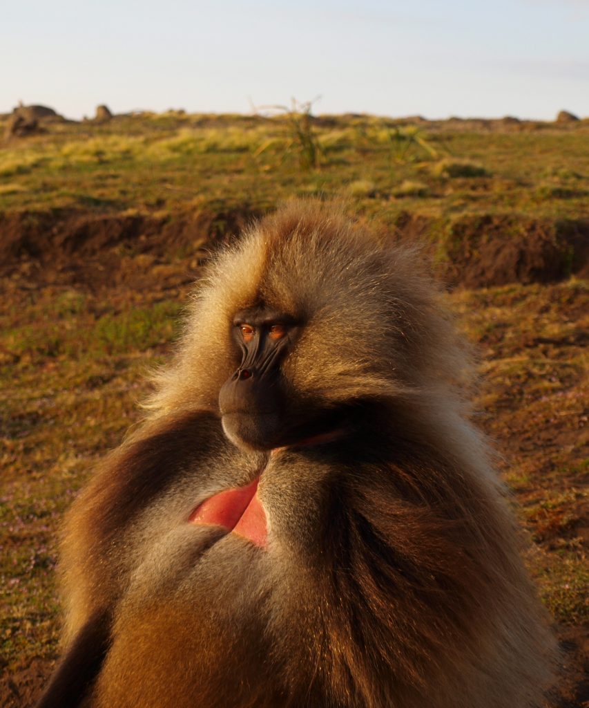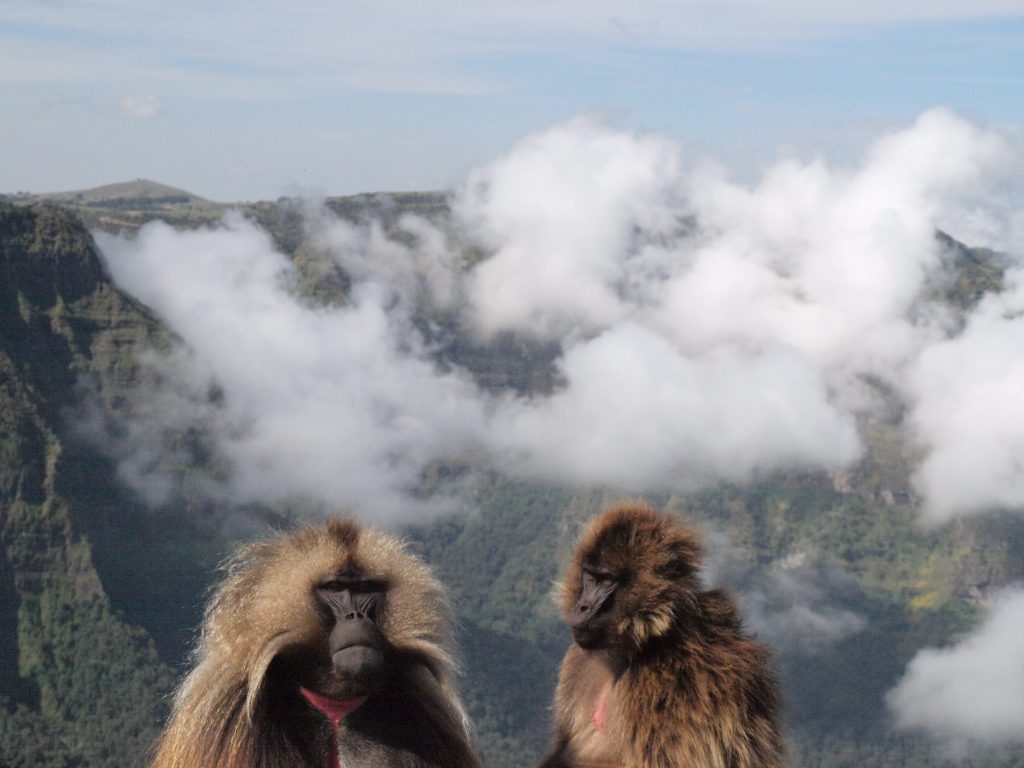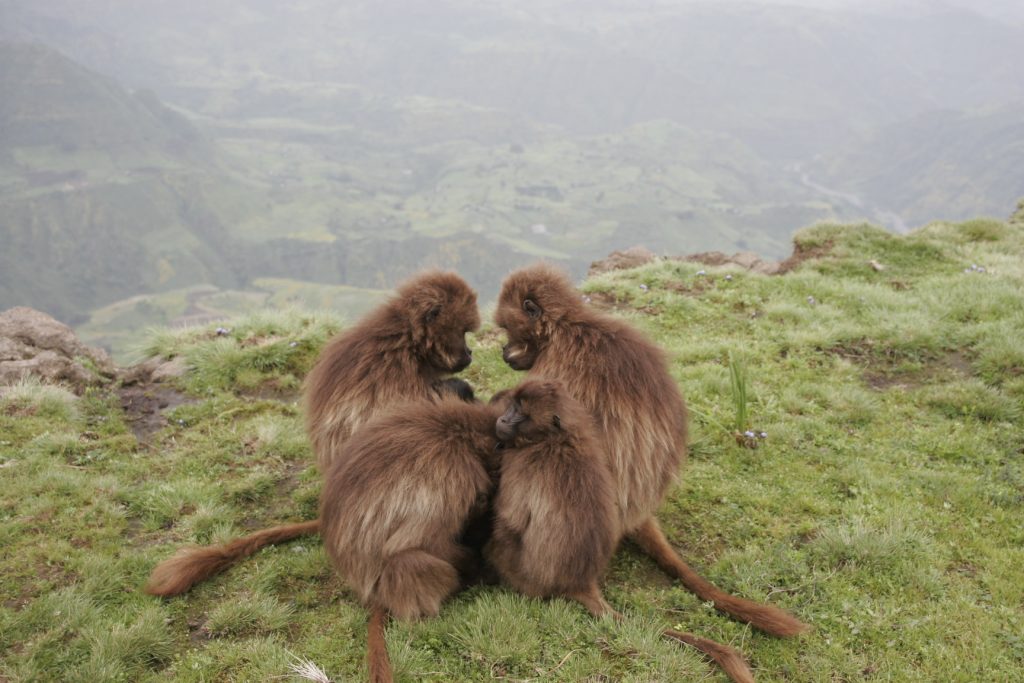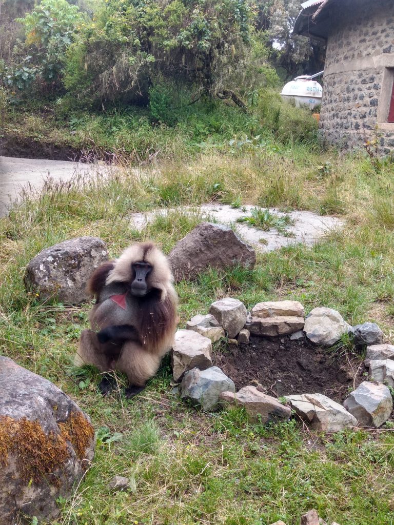 Studying geladas is hard work, but if you enjoy the mountains, hiking and keeping up with monkey drama, then the Simien Mountains is the best place to be! Each morning after a cup of freshly brewed Ethiopian coffee, we set out early to find our study groups and spend the day collecting various kinds of data (hormones, isotope, urine, DNA, focal observations, census, vocal recordings to name a few) from them. The terrain is spectacular, but can be exhausting when chasing geladas up and down the mountainside. Working at high altitudes also means less oxygen for us humans, so it can be a little challenging at times. The geladas can make it easy for us sometimes by grazing and socializing for long hours on the plateaus!